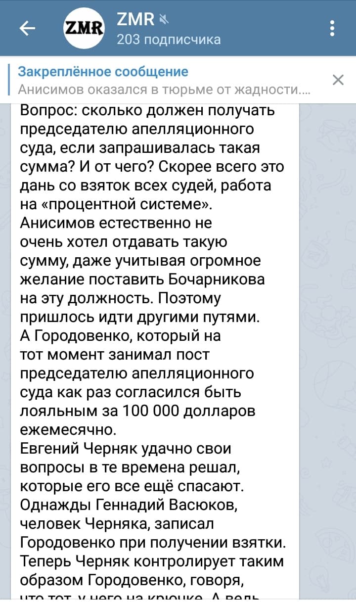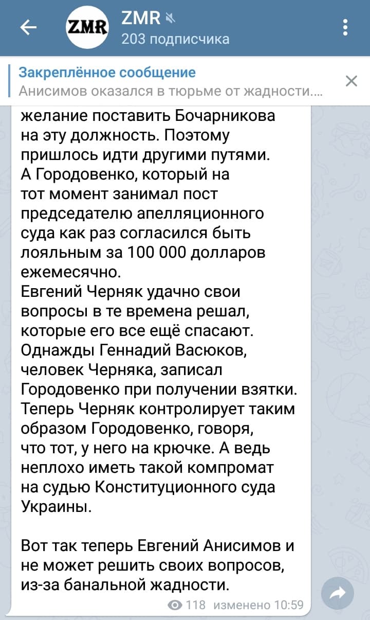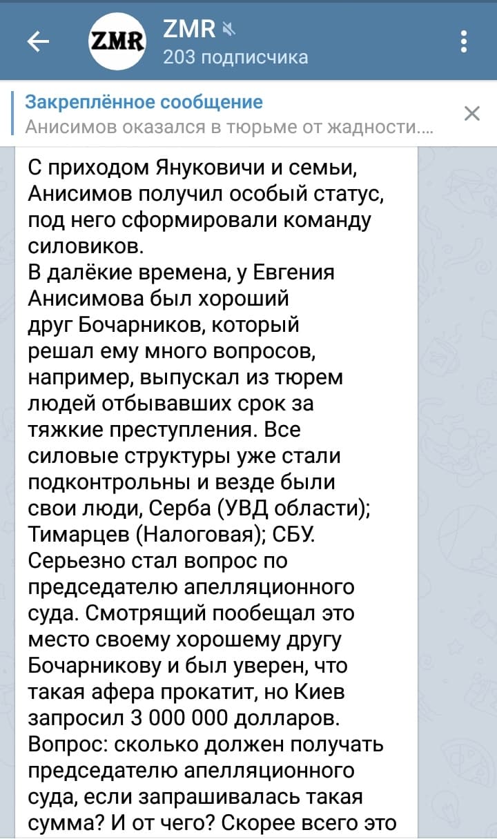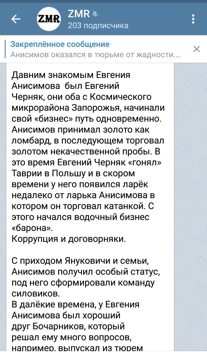 Анисимов оказался в тюрьме от жадности. Все уже знают про его задержание. А все знают про его путь становления, помимо того, что пишут в газетах? Вспомним 90-е и других влиятельных «бизнесменов» Запорожья. К чему это? Все просто, в одиночку сложно начинать подобный «бизнес». Давним знакомым Евгения Анисимова был Евгений Черняк, они оба с Космического микрорайона Запорожья, начинали свой «бизнес» путь одновременно. Анисимов принимал золото как ломбард, в последующем торговал золотом некачественной пробы. В это время Евгений Черняк «гонял» Таврии в Польшу и в скором времени у него появился ларёк недалеко от ларька Анисимова в котором он торговал катанкой. С этого начался водочный бизнес «барона». Коррупция и договорняки. С приходом Януковичи и семьи, Анисимов получил особый статус, под него сформировали команду силовиков. В далёкие времена, у Евгения Анисимова был хороший друг Бочарников, который решал ему много вопросов, например, выпускал из тюрем людей отбывавших срок за тяжкие преступления. Все силовые структуры уже стали подконтрольны и везде были свои люди, Серба (УВД области); Тимарцев (Налоговая); СБУ. Серьезно стал вопрос по председателю апелляционного суда. Смотрящий пообещал это место своему хорошему другу Бочарникову и был уверен, что такая афера прокатит, но Киев запросил 3 000 000 долларов. Вопрос: сколько должен получать председателю апелляционного суда, если запрашивалась такая сумма? И от чего? Скорее всего это дань со взяток всех судей, работа на «процентной системе». Анисимов естественно не очень хотел отдавать такую сумму, даже учитывая огромное желание поставить Бочарникова на эту должность. Поэтому пришлось идти другими путями. А Городовенко, который на тот момент занимал пост председателю апелляционного суда как раз согласился быть лояльным за 100 000 долларов ежемесячно. Евгений Черняк удачно свои вопросы в те времена решал, которые его все ещё спасают. Однажды Геннадий Васюков, человек Черняка, записал Городовенко при получении взятки. Теперь Черняк контролирует таким образом Городовенко, говоря, что тот, у него на крючке. А ведь неплохо иметь такой компромат на судью Конституционного суда Украины. Вот так теперь Евгений Анисимов и не может решить своих вопросов, из-за банальной жадности.