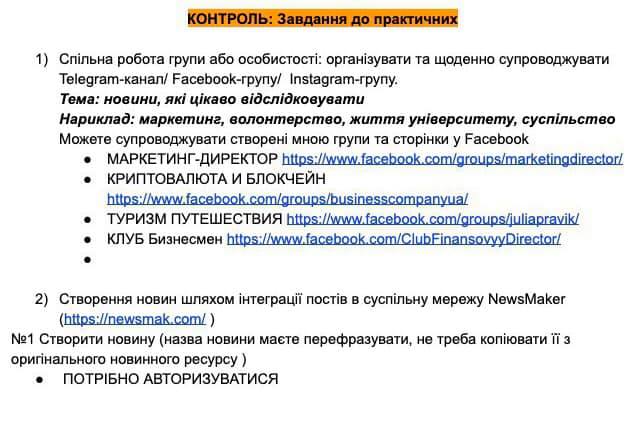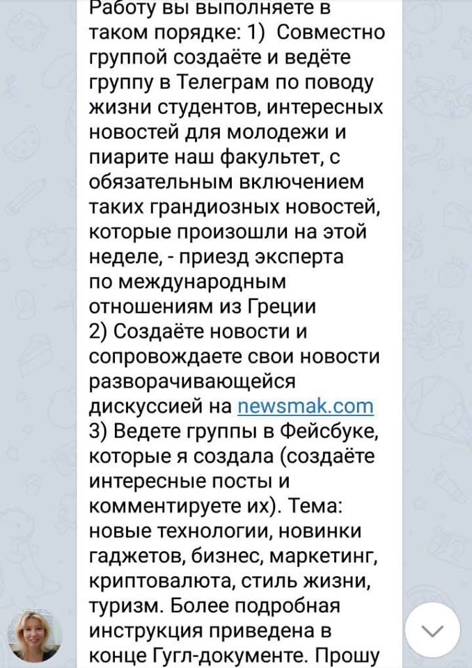 Следующий камбек Правик вновь стал резонансным. В октябре текущего года ее заметили в составе преподавателей Национального авиационного университета. Правик преподавала SMM и, по словам родственницы одной из студенток, задавала своим подопечным писать статьи на свой сайт NewsMaker, вести ее группы в соцсетях, создавать Telegram-каналы и раскручивать их.