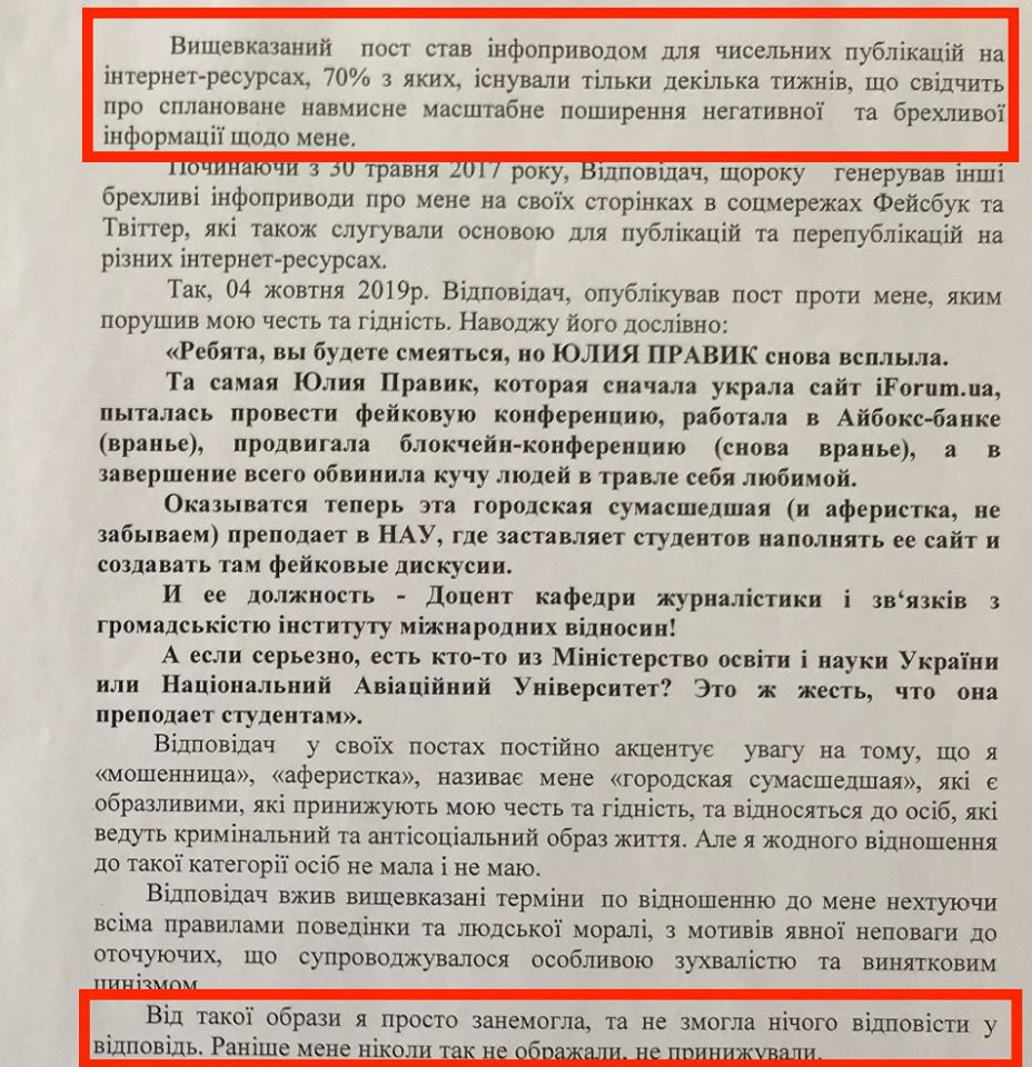 Об этом он сообщил в Facebook. Правик обвинила его в интернет-травле, порочащей ее деловую репутацию, честь и достоинство. И требует 2 млн грн за моральный ущерб. Редактор AIN.UA детально рассказывает о сложившейся ситуации.