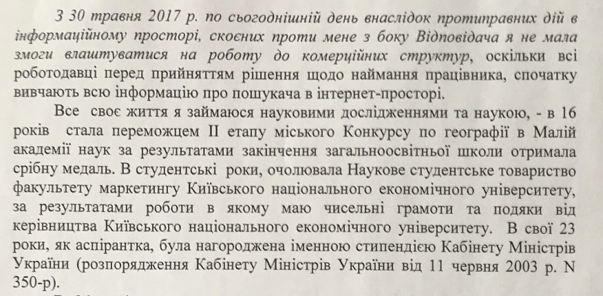 Также в документе говорится, что Правик не может устроиться на работу из-за негативной информации о ней в интернете, начиная с 30 мая 2017 года.