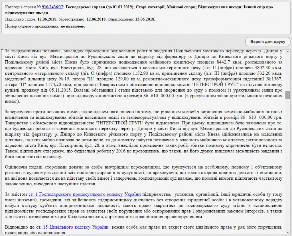 Однако, судебный эксперт подтвердила, что основная причина разрушения зданий и строений указанного имущественного комплекса – строительство Подольского мостоперехода. Итог – решение о выплате ООО компенсации в размере 80,6 млн гривен.