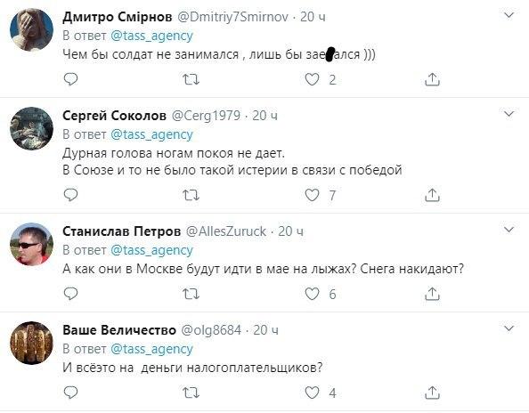 "Идут в Москву изгонять Путина", "Чем-нибудь дельным заняться не судьба была", "Дурная голова ногам покоя не дает. В Союзе и то не было такой истерии в связи с победой", "Обалдеть у них сила духа", - пишут в комментариях.