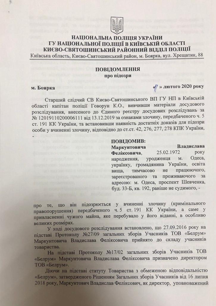 Впрочем, это не единственное правонарушение Маркунтовича на своей должности. Так, придя в компанию Velgevos Enterpises Limited в 2012 году, он смог войти в доверие к собственникам и воспользовался этим в своих целях: Маркунтовичу удалось тайно переоформить на себя много активов (компании, недвижимость). Когда об этом стало известно собственникам – мошенник сразу же покинул Украину. Пример такой деятельности: подделка документов на квартиру.