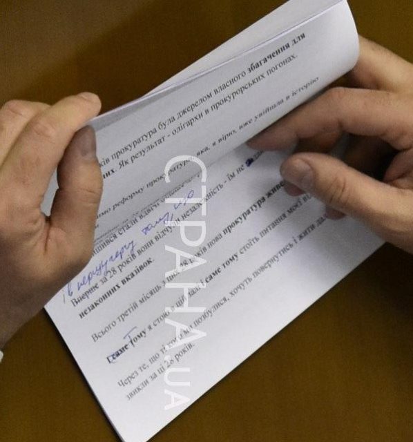 Также в кадр «Страны» попала и речь бывшего генерального прокурора, записанная на бумаге для цитирования перед депутатами Верховной Рады.