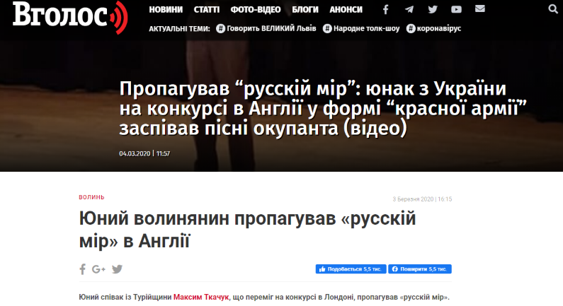 На Волыни травлей и негодованием встретили 12-летнего земляка Максима Ткачука, который привез победу сразу в трех номинациях песенного конкурса Stars of the Albion в Лондоне, обойдя представителей 23 стран. Как выяснилось, конкурс был посвящен 75-летию Победы во Второй мировой войне.