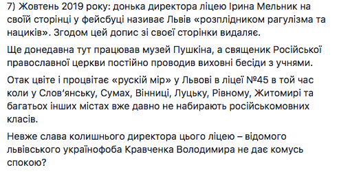 “Сьомий рік війни з Росією, а львівський ліцей №45 нещодавно знову оголосив про прийом учнів у 1 клас з російською мовою навчання! Вперто не бажає директор ліцею переводити ліцей на українську мову. Напевно “рускій мір” їй ближче, тому варто очікувати ліцею на нових сепаратистів, біженців, переселенців, малоросів, новоросів та інші українофобів.