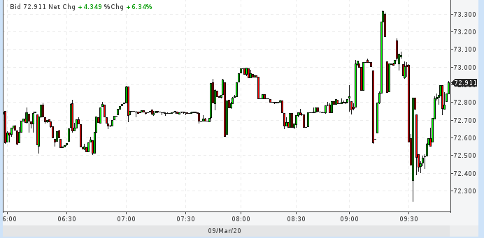 После обвала цен на нефть в России упал курс рубля. Так, доллар вырос до 72,91 рубля, а евро до 82,2 рубля, достигнув своего максимума с начала 2016 года.