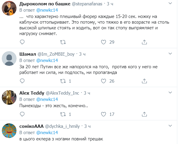 "Что характерно плешивый фюрер каждые 15-20 секунд ножку на каблучок оттопыривает. Это потому, что тяжко в его возрасте на столь высокой шпильке стоять и ходить, вот он так стопу выпрямляет и нагрузку снимает", "За 20 лет Путин все же напоролся на того, против кого у него не работает ни сила, ни подлость, ни пропаганда", "Пынеходы - это жесть, конечно", "У этого эклера с ногами полный трэш", – писали в сети.