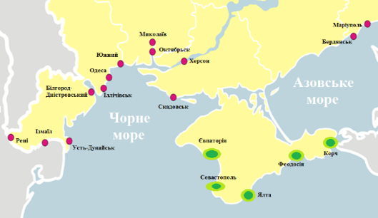 На карті можна побачити, де розташовані 13 морських портів України, які зараз працюють (усього у нас їх 18).