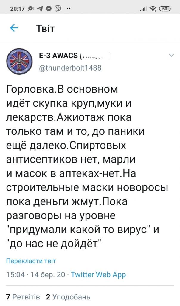 «В основном идет скупка круп, муки и лекарств. Ажиотаж пока только там. И то, до паники еще далеко. Спиртовых антисептиков нет, марли и масок в аптеках-нет. На строительные маски жители деньги жмут. Пока разговоры на уровне «придумали какой то вирус» и «до нас не дойдет»