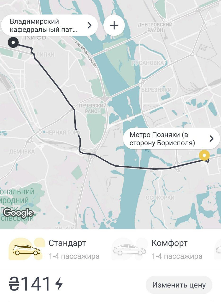 Цены на вызов не очень отличаются от обычных. Например, чтобы добраться с Позняков до центра Киева (Владимирский собор на бульваре Шевченко) на такси Bolt утром нужно было выложить минимум 129 грн.