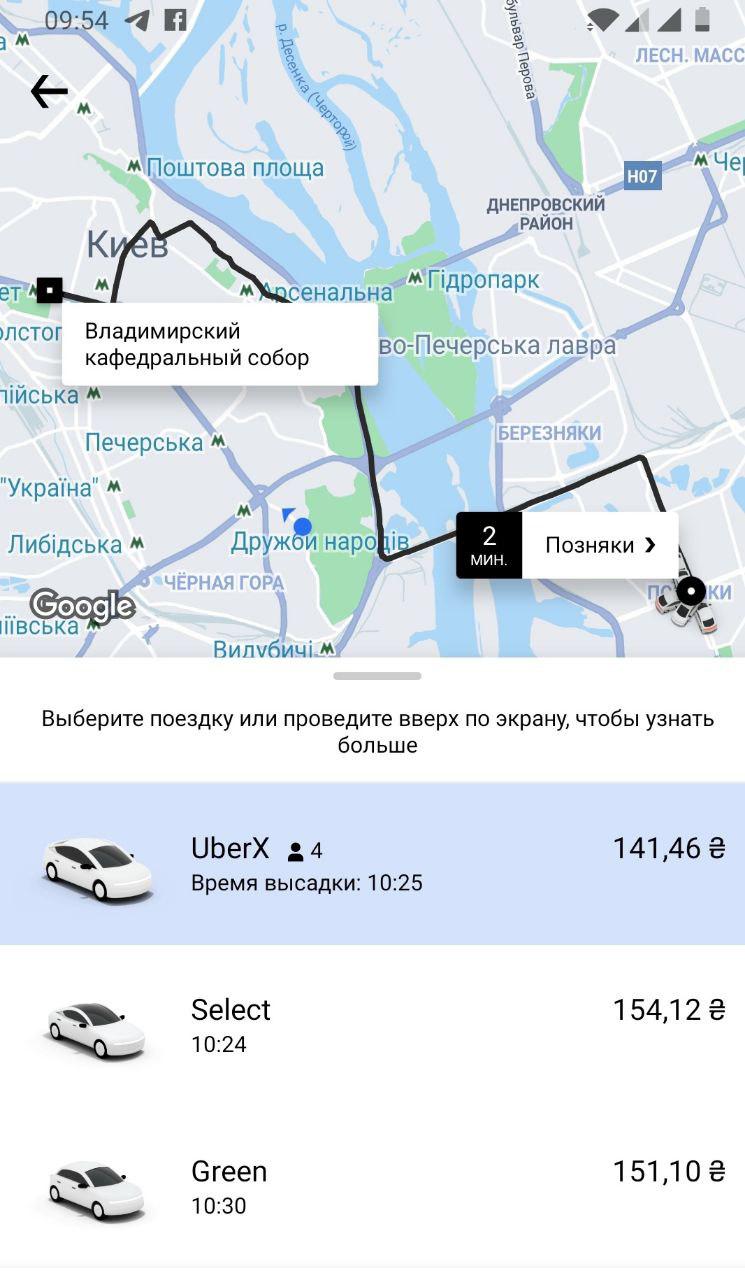 Почти столько же стоит поездка с левого берега в центр на Uber: 141,46 грн по минимальному тарифу, 150 по бизнес-тарифу.