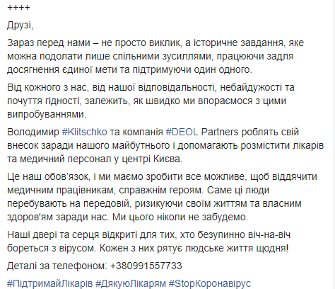 "Владимир Кличко и компания Deol Partners делают свой вклад ради нашего будущего и помогают разместить врачей и медицинский персонал в центре Киева", - сказано в сообщении.