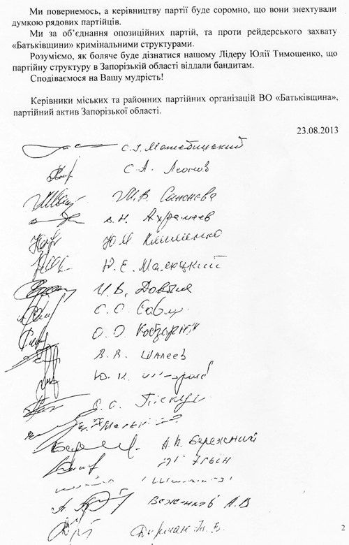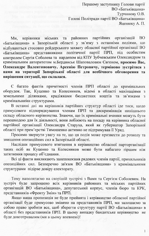 Ми, керівники міських та районних партійних організацій ВО «Батьківщина» в Запорізькій області у зв’язку з останніми подіями, що відбуваються стосовно рейдерського захвату обласної партійної організації ВО «Батьківщина» представниками політичної партії ПРП, під особистим контролем Сергія Соболева та нардепом від КПУ Зубчевським Олександром та кримінальним авторитетом м. Бердянськ Шаповаловим Євгеном, просимо Вас, Олександре Валентиновичу, Арсенію Петровичу, терміново зустрітися з нами на території Запорізької області для всебічного обговорення та вирішення ситуації, що склалася. Є багато фактів причетності членів ПРП області до кримінальних оборудок. Так, Куценко та Колесников, відомі в області махінаціями з земельними ділянками, крадіжками бюджетних коштів та зв’язками з кримінальними структурами.