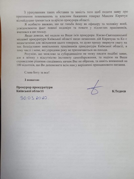 "Прибыв по вашему указанию, работники Генеральной инспекции вместо проверки фактов незаконных действий Максима Киричука и его команды начали выяснять у прокуроров, кто первый, второй или третий подписал это обращение и вообще зачем было писать такое. Следовательно, работники Генеральной инспекции, в очередной раз вместо выяснения объективных причин таких действий, начали психологически давить на прокуроров. Хорошо, что не вложили на пол и не сделали фотографии будто с преступниками", - написал Тедеев.
