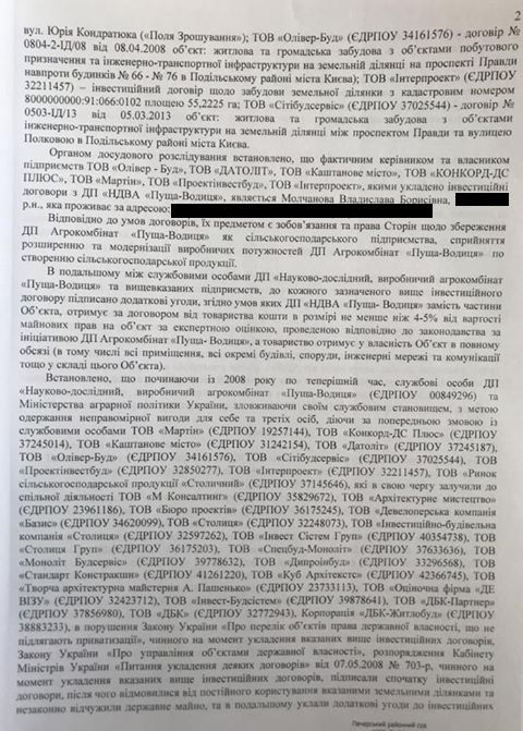 По данным следствия, в 2008-2015 годах госпредприятие заключило ряд инвестиционных договоров, по которым передало под застройку более 200 гектаров в Подольском районе столицы. В ответ ГП "Пуща-Водица" получило имущественные права на 4-5% жилой площади объектов строительства.