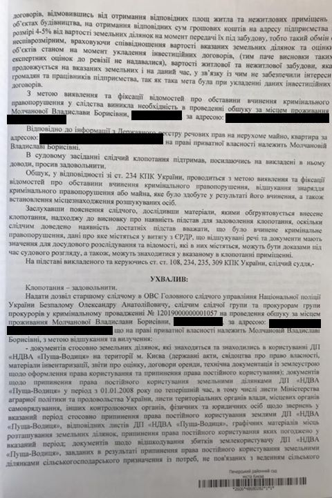 Обыск разрешен по месту жительства Молчановой по ул. Крамского, 9 в Киеве в рамках дела о незаконном переходе сельскохозяйственных земель государственного предприятия (ГП) "Пуща-Водица" в управление частных строительных компаний, в рамках расследования уголовного производства по ч. 5 ст. 191 и ч. 2 ст. 364, касательно завладения госимуществом.