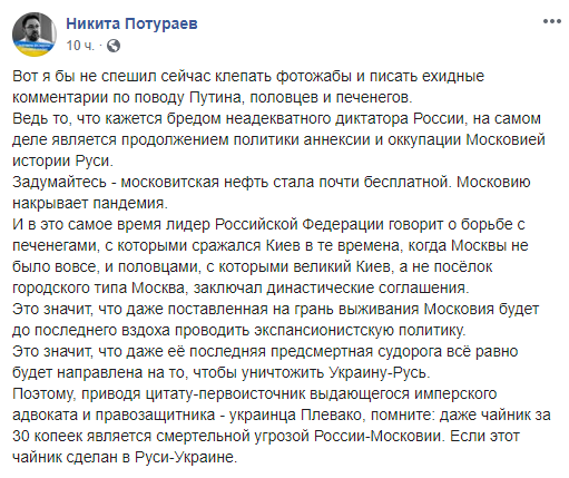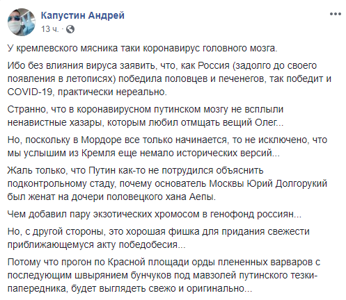 “Наша страна не раз проходила через серьезные испытания: и печенеги ее терзали, и половцы, — со всем справилась Россия. Победим и эту заразу коронавирусную. Вместе мы все преодолеем,” — сказал президент в своей речи в среду.