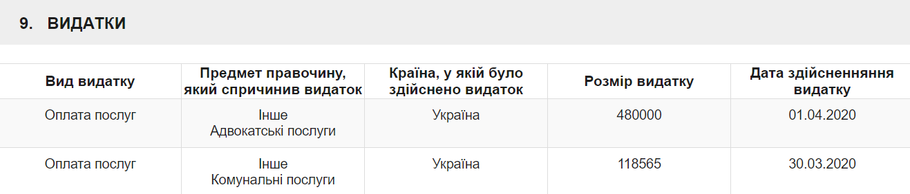 Також колишній гарант задекларував видатки. Політик сплатив 480 тисяч гривень за адвокатські та 118 тисяч 565 тисяч гривень за комунальні послуги.