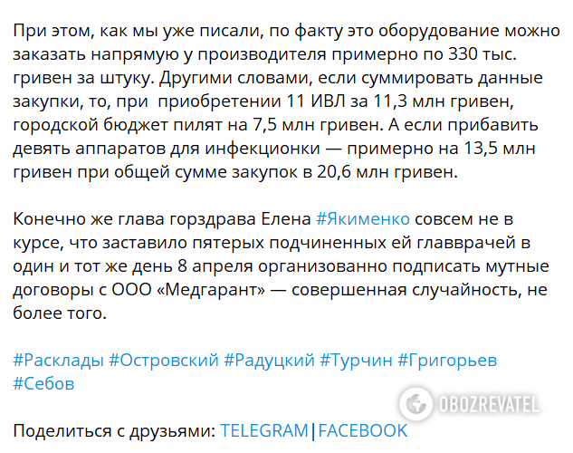 "Так вот оказалось, что в схеме замешана не только инфекционка и главврач Светлана Лаврюкова, но и городские больницы №11, №1, №10 и роддом №2. Пламенный привет главврачам Николаю Турчину, Евгению Григорьеву, Денису Себову и Максиму Голубенко соответственно. Товар во всех случаях один и тот же – аппараты ИВЛ Dixion Aeros 4600 производства российской федеральной медицинской торговой сети Dixion, 11-я больница покупает три, первая – столько же и 10-я – четыре, а роддом – еще один. Цена такая же, как и для городской инфекционки – 1,028 млн гривен", – сообщается в тексте.
