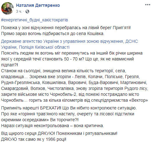 "Объясните людям, как огонь мог перекинуться на другую сторону реки ширина которой в среднем течении составляет 50-70 м? Что это, как не умышленный поджог?!", - написала она.
