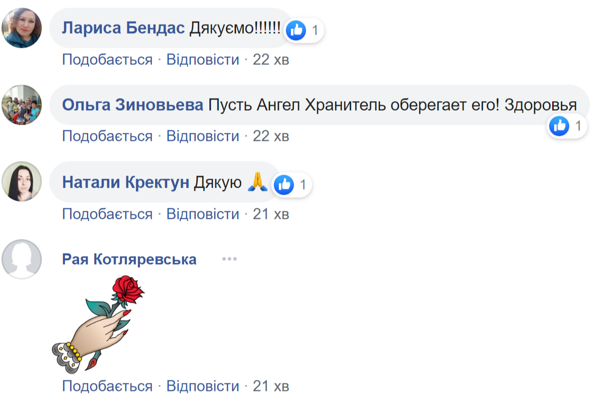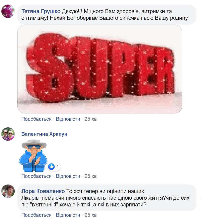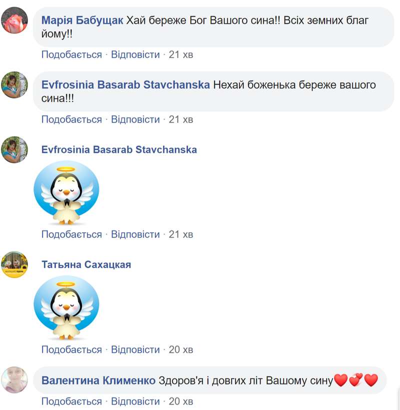 "Спасибо!!!", "Пусть хранит Бог вашего сына!!! Всех земных благ ему!!!", "Спасибо!!! Здоровья крепкого!!!", "Пусть Ангел Хранитель оберегает его! Здоровья", "Благодарю!!! Крепкого вам здоровья, выдержки и оптимизма! Пусть Бог хранит вашего сыночка и всю вашу семью", – написали они.