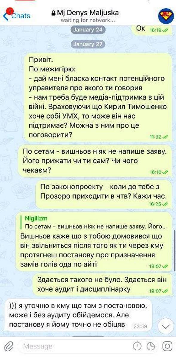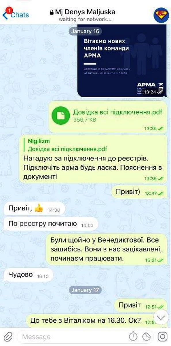 Судя по переписке, Денис Малюська в январе поделился с на тот момент и.о. директора Государственного бюро расследований Ириной Венедиктовой телефонами Виталия Сигидина и Владимира Павленко, фактически дав "зеленый свет" для их назначения в АРМА.