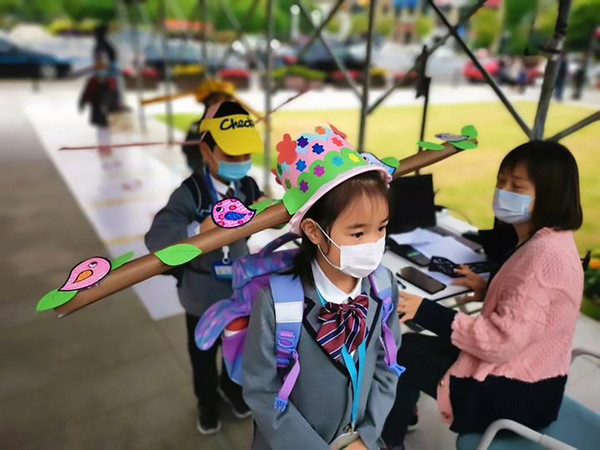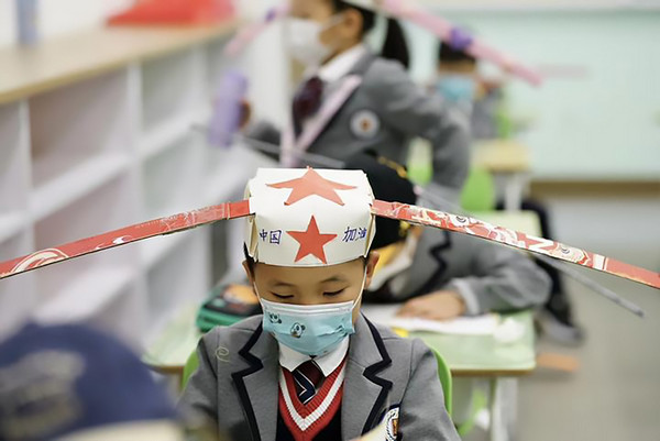 В одной из школ китайского города Ханчжоу, где после длительного карантина возобновились занятия, в качестве меры безопасности обязали учеников носить не только защитные маски, но и необычные головные уборы.