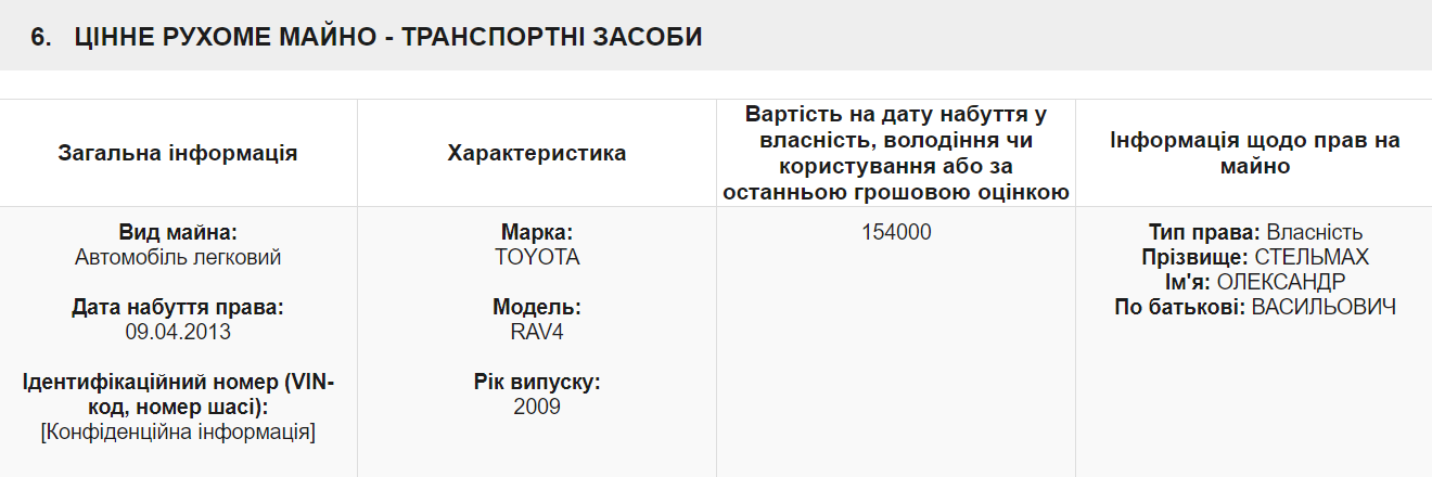 З цінного рухомого майна у декларації Стельмахаза минулий рік є лише авто Toyota RAV4 2009 року випуску.