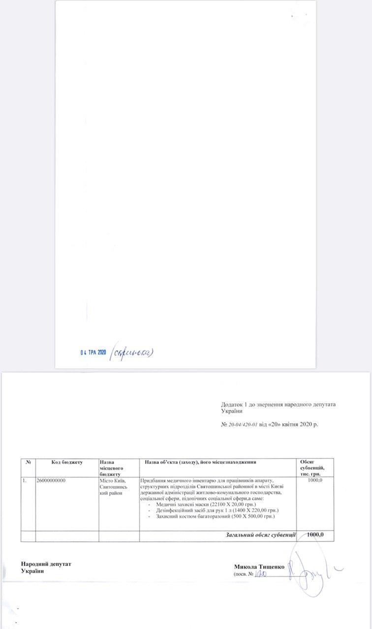 Народний депутат фракції «Слуга народу» Микола Тищенко звернувся до мера Києва Віталія Кличка за субвенцією для закупівлі медичних масок для Святошинського району Києва.