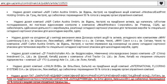 Недавно нікому не відомий закритий недиверсифікований венчурний корпоративний інвестиційний фонд "Титан" отримав дозвіл від АМКУ на придбання частки, що забезпечує перевищення 50% голосів у вищому органі управління товариства - в статутному капіталі компанії "Білоцерківвода".