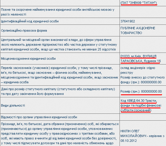 Фонд "Титан" зареєстрований за столичною адресою: вулиця Тарасівська, будинок 16. Розмір статутного капіталу дорівнює фантастичним 800 млн грн, керівником зазначений Олег Нікітін. Ця установа здійснює приватне розміщення цінних паперів інститутів спільного інвестування серед юридичних та фізичних осіб.