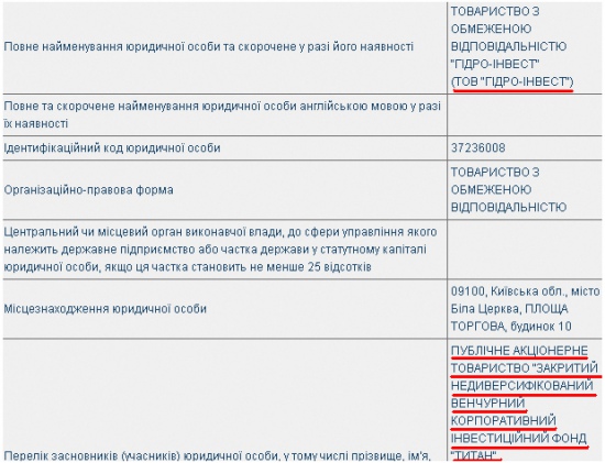 Цікавий факт: компанія "Гідро-інвест", що на 100% належить фонду "Титан", зареєстрована у Білій Церкві на площі Торговій, 10.