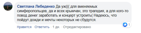 «Для вменяемых симферопольцев, да и всех крымчан это трагедия, а для кого-то повод заработать и концерт устроить», — написала в Facebook Светлана Лебеденко, выразив надежду, что пойдут дожди и планы устроителей концерта не будут реализованы.
