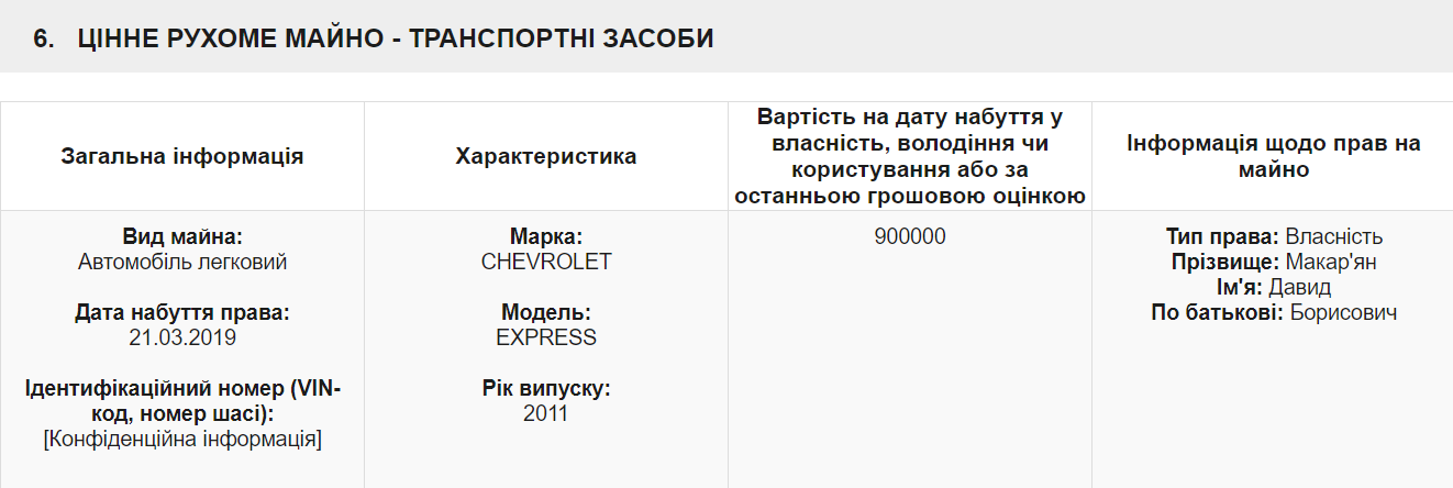 У декларації кандидата на посаду заступника Віце-прем’єр-міністра України – Міністра з питань реінтеграції тимчасово окупованих територій України, поданій у березні цього року вказано, що Макар’ян володіє ще однією елітною автівкою – Chevrolet Express 2011 року випуску за 900 тисяч гривень.