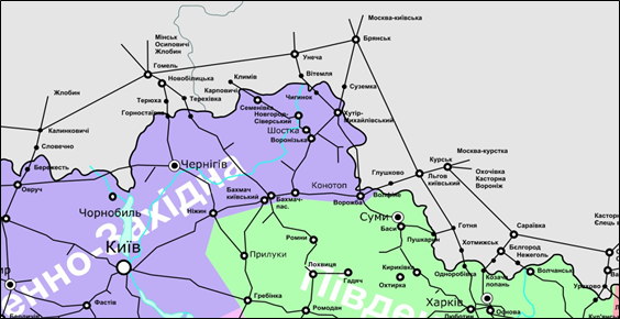 ⮚ залізниця Москва – КПП «Суземка» / КПП «Зернове» (Хутір-Михайлівський) – Конотоп – Крути – Ніжин – Київ.