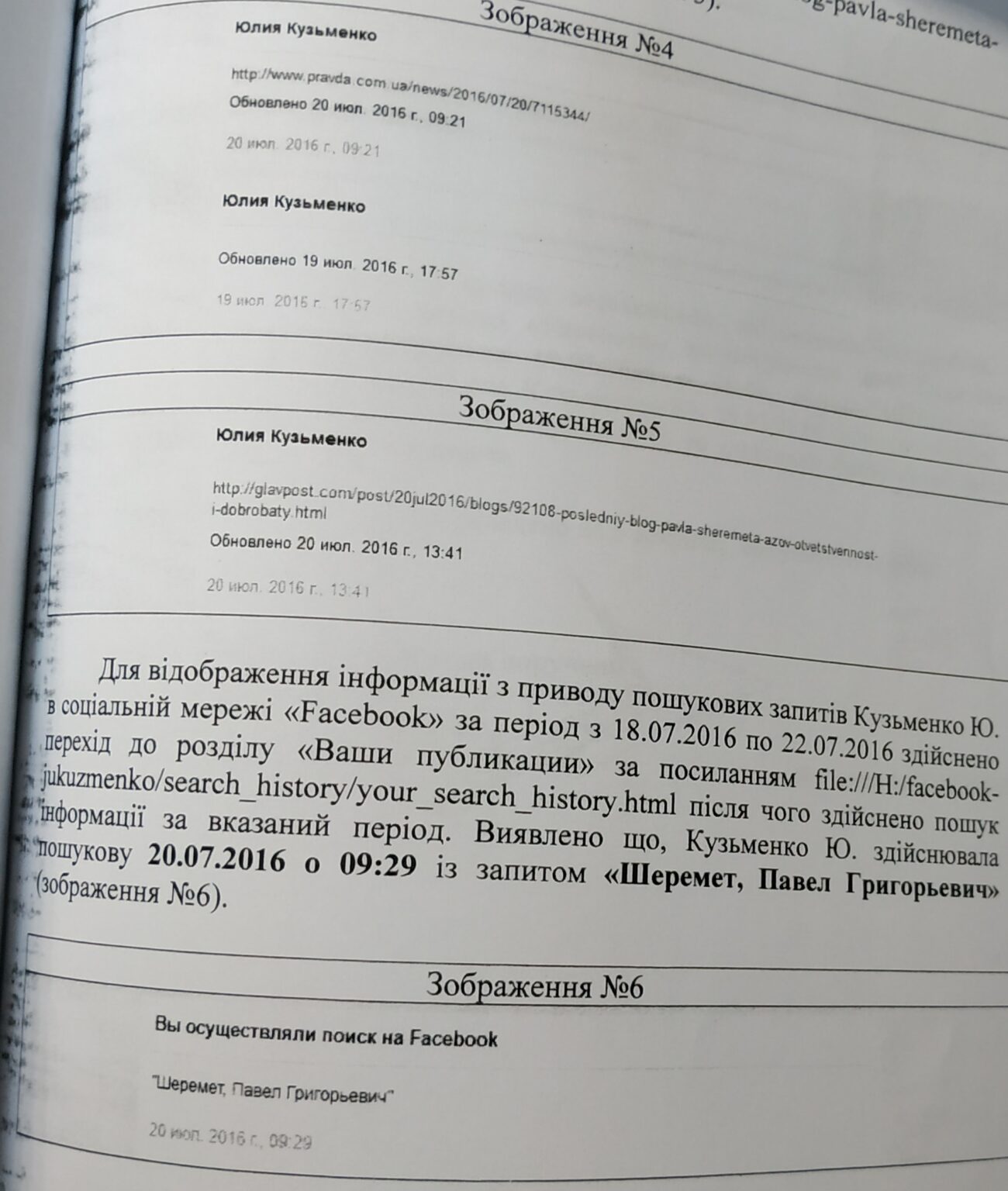 «20.07.2016 перша публікація розміщена о 09.21, а саме посилання (лінк на новину видання «Українська правда» — Ред.), в якому йдеться про вбивство Шеремета П. Окрім цього виявлено публікацію, розміщену Кузьменко Ю. 20.07.2016 о 13.41, а саме посилання, в якому йдеться про про вбивство Шеремета П. (стаття про останній блог Павла Шеремета про добробати — Ред.)», — ідеться в матеріалах кримінальної справи щодо вбивства журналіста, де аналізується активність підозрюваної у соцмережах.