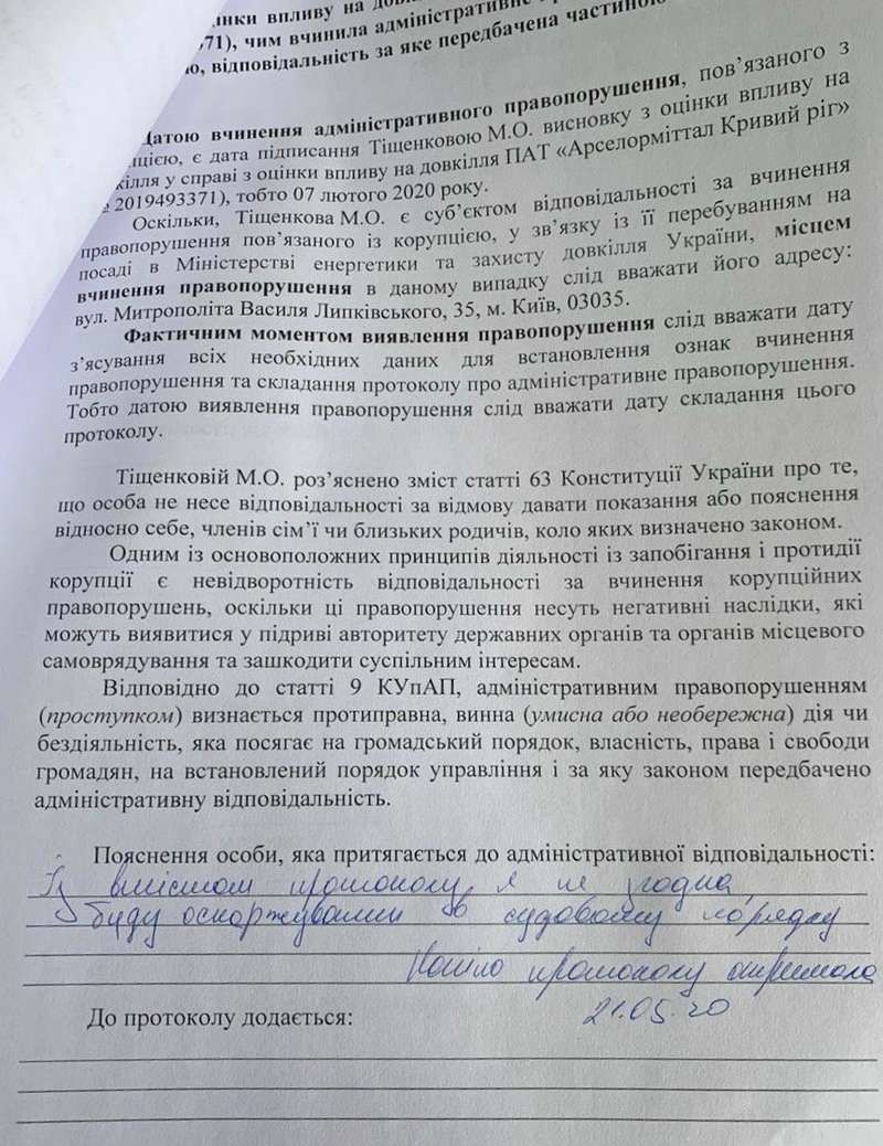 Як стало відомо, протоколи вручено начальнику Управління оцінки впливу на довкілля та стратегічної екологічної оцінки Марині Тіщенковій, підрозділ якої відповідає за безперебійну роботу Єдиного реєстру з оцінки впливу на довкілля та своєчасну видачу документів.