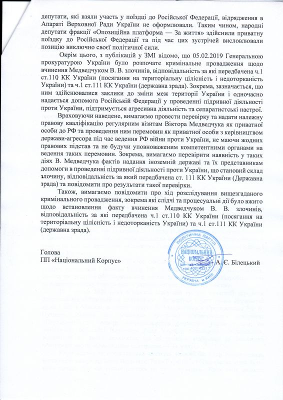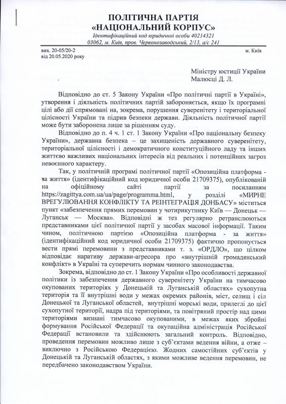 “Мы, Национальный Корпус, уже подали соответствующее заявление в СБУ с требованием начать производство против руководителей ОПЗЖ и в Минюст с иском в суд по факту совершения партией государственной измены”, – сообщается на сайте Нацкорпуса.