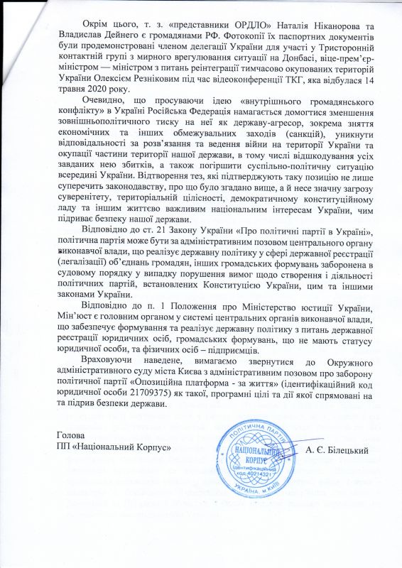 Согласно информации на сайте “Национального Корпуса”, лидер партии Андрей Билецкий лично обратился к главе СБУ Ивану Баканову и министру юстиции Украины Денису Малюське с требованием отреагировать на деятельность ОПЗЖ, которая, по его мнению, угрожает территориальной целостности Украины.
