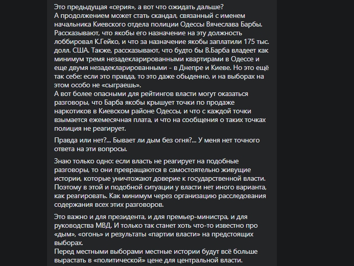"Более опасными для рейтингов власти могут оказаться разговоры, что Барба якобы крышует точки по продаже наркотиков в Киевском районе, и что с каждой точки взымается ежемесячная плата, и что на сообщения о таких точках полиция не реагирует", - пишет журналист.