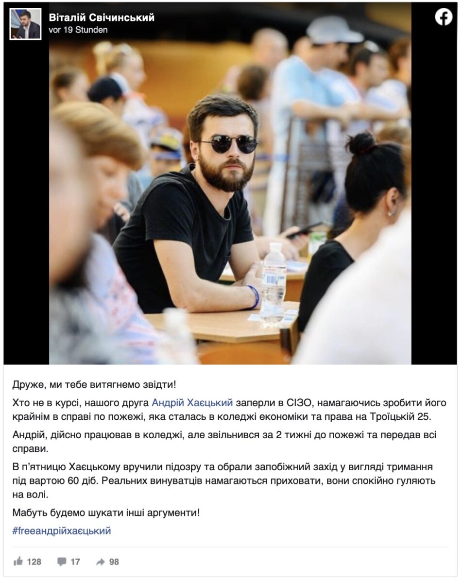 Хаецкий занимал должность заместителя директора Одесского колледжа экономики, права и гостинично-ресторанного бизнеса по административно-хозяйственной работе. При этом он не был ответственным за пожарную безопасность. Из лицея Хаецкий уволился еще в ноябре. После должность замдиректора по АХЧ занимала Татьяна Соловей, но она проходит по этому делу только в качестве свидетеля.
