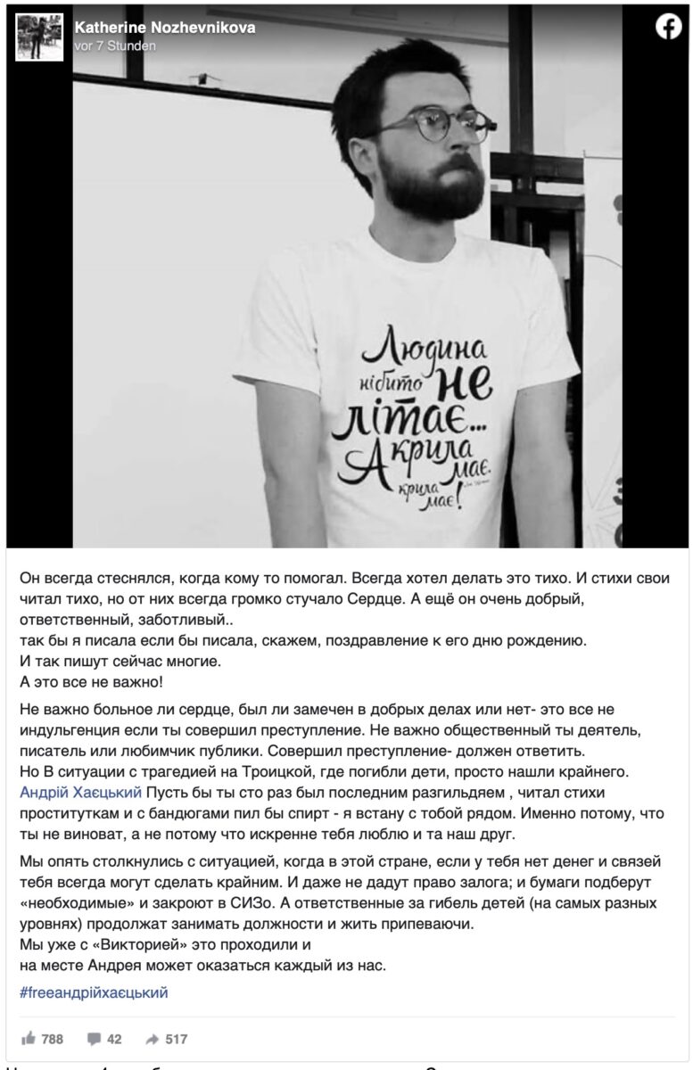 Правоохранители утверждают, что Хаецкий скрывался от следствия. Друзья мужчины говорят, что это неправда. По их словам, когда Хаецкий узнал из СМИ о том, что ему заочно сообщили о подозрении, он 21 мая сам пришел к следователю. «Ему вручили сообщение о подозрении, повестку в суд о мере пресечения и допросили. На рассмотрение ходатайства об избрании меры пресечения 22 мая Андрей тоже самостоятельно явился в Киевский районный суд, где его и взяли под стражу», — говорит один из друзей поэта.