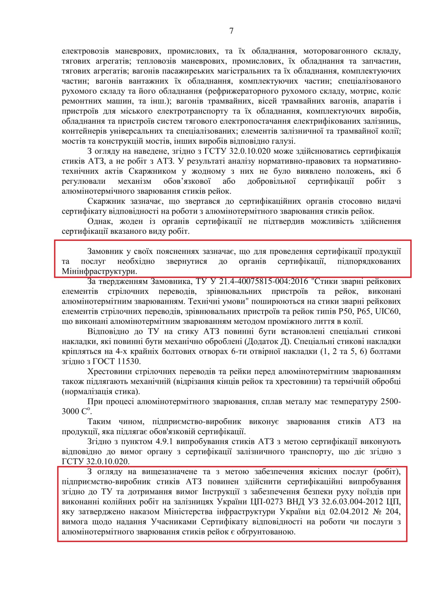 Такі дії свідчать про змову Замовника та ТОВ «Грінекс-Еко» з метою недопущення інших учасників до виконання робіт з алюмінотермітного зварювання рейок та не мають нічого спільного з роз’ясненнями наданими в рішеннями АМКУ щодо безпеки руху поїздів та вимог ТУ У 21.4-40075815-004:2016.