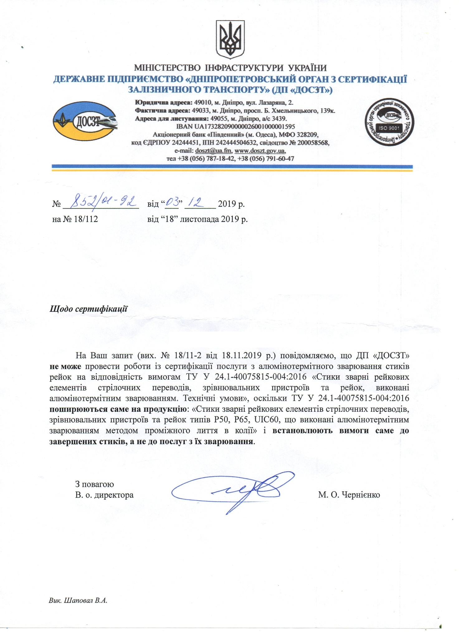 Наприклад, безпідставно додали так звану вимогу «сертифікації відповідності» на роботи з алюмінотермітного зварювання. Її повинен видавати нібито орган сертифікації, який чітко підпорядкований Мінінфраструктури. Ця вимога нібито не обов’язкова, але прописана теж під «свої компанії», бо в нормативній документації АТ «УЗ» - відсутня.