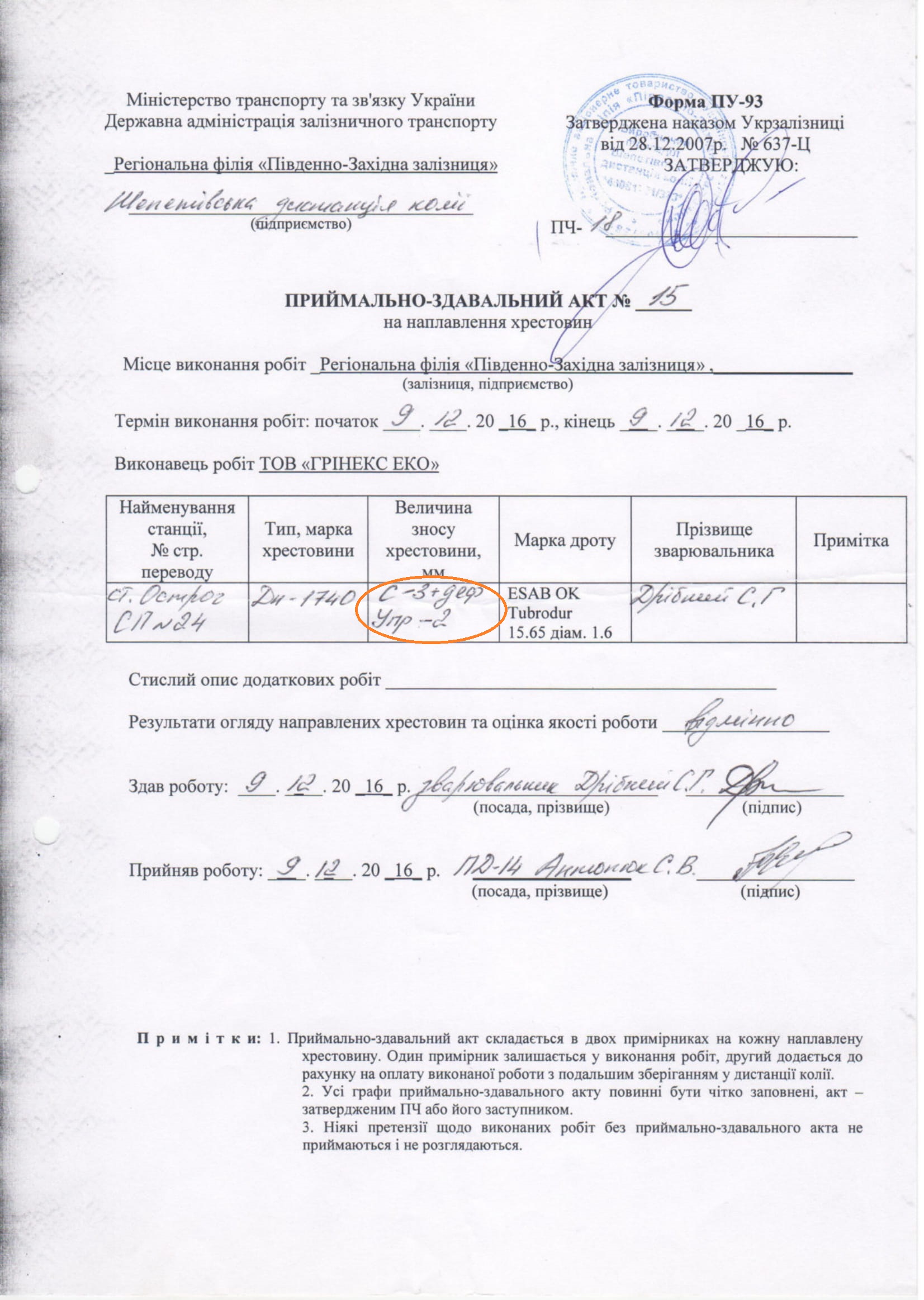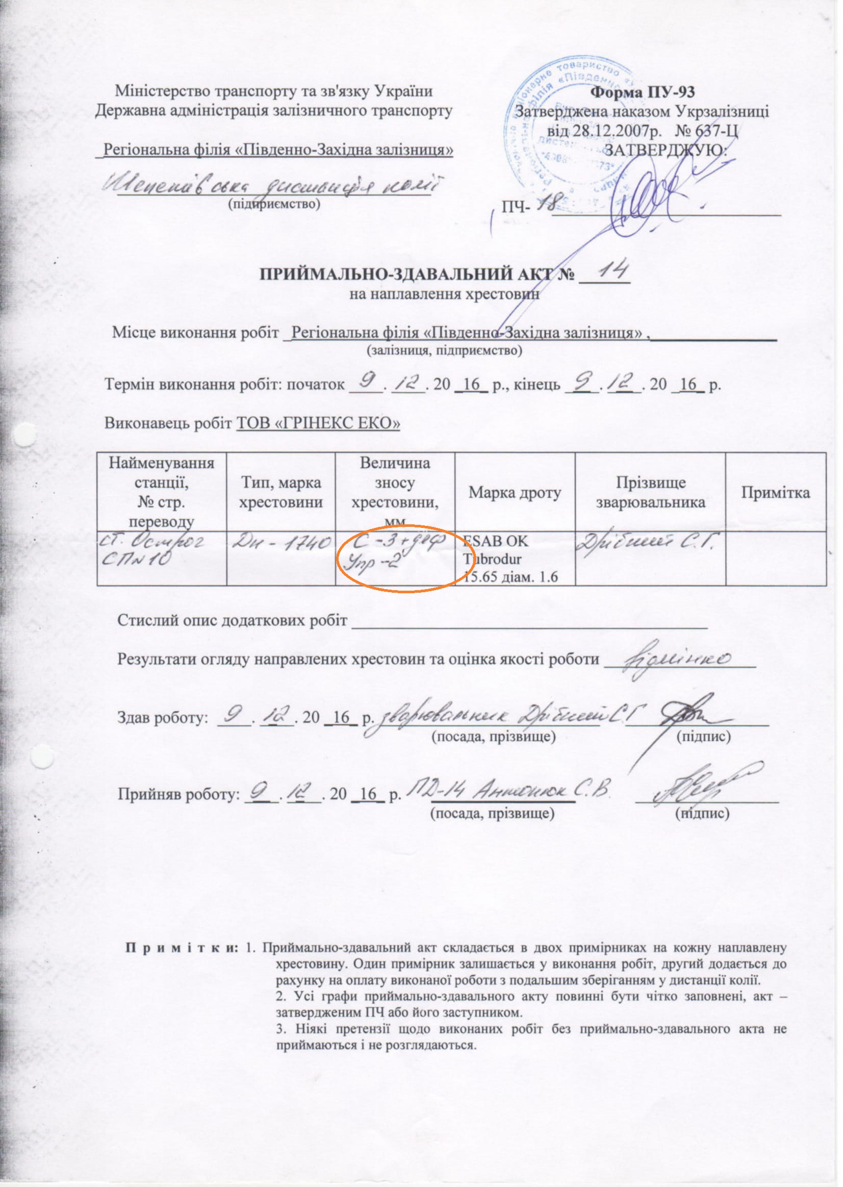 UA-2016-09-21-001238-c укладено договір № ПЗ/П-161196/НЮ від 31.10.2016 року між регіональною філією «Південно-Західна залізниці» ПАТ «Українська залізниця» та ТОВ «Грінекс-Еко», про надання послуги з наплавлення хрестовин стрілочних переводів. Сума договору складала 3 896350,00 грн.