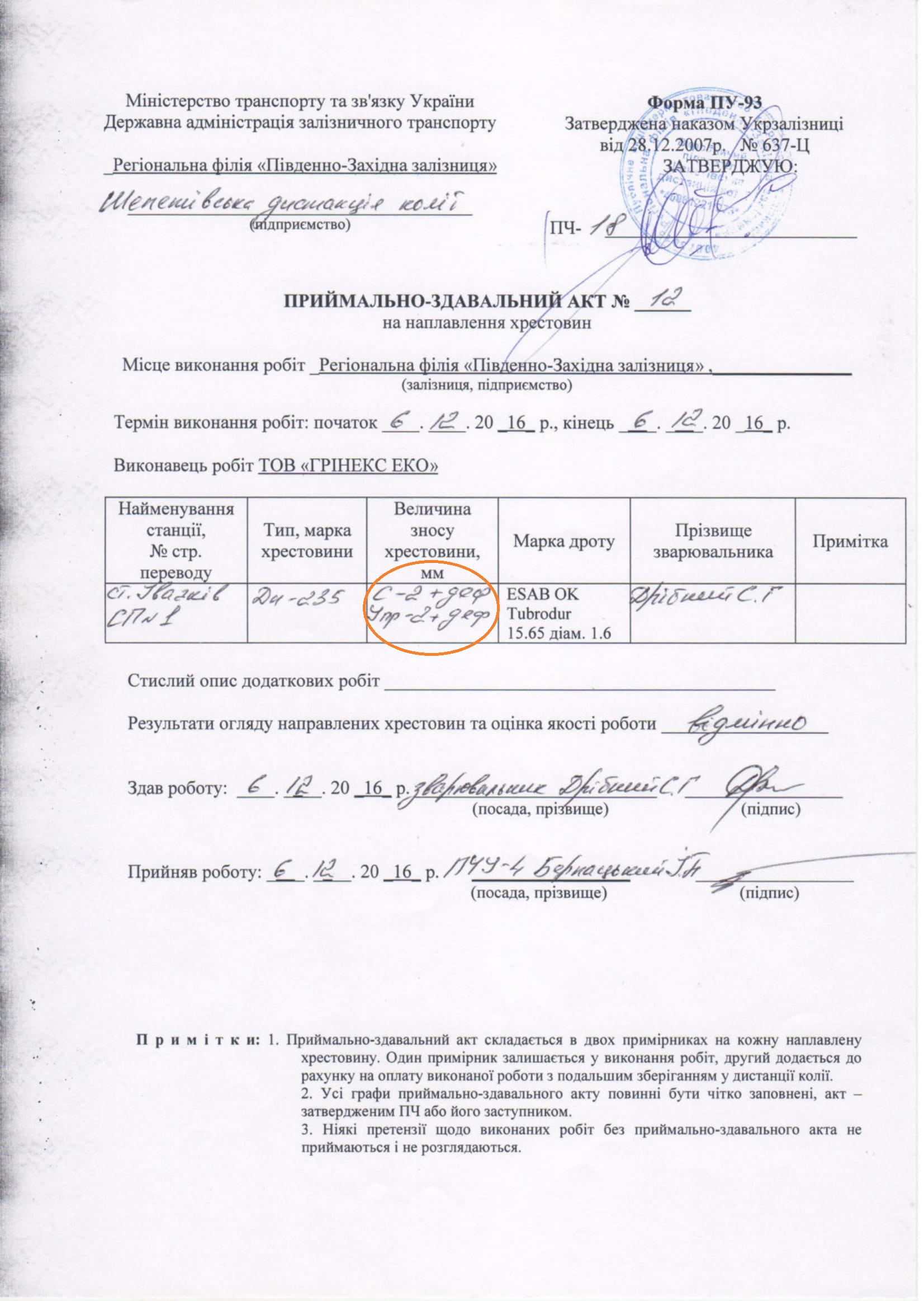 Та найбільше вражає те, що «Укрзалізниця» платить чималі кошти ТОВ «Грінекс-Еко» прикриваючись фіктивними документами. Із оприлюднених документів (акти за формою ПУ-93), які були оформлені під час виконання договору №ПЗ/П-161197/НЮ від 31.10.2016 р., фахівцями встановлено, що ТОВ «Грінекс-Еко»» виконало наплавлення 298 хрестовин стрілочних переводів. При цьому, з погодження Замовника - регіональної філії «Південно-Західна залізниця», наплавлені хрестовини згідно діючих технічних ТУ 24.1.30268559-304:2015, затверджених АТ «Укрзалізниця», не підлягають наплавленню (згідно ТУ наплавлення хрестовин допускається при умові, що їх знос складає не менше 5 мм для головних колій та для приймально-відправних – 8 мм) і практично не мають зносу. Це конкретно ставить під сумнів виконання даних робіт і вказує на фіктивне оформлення фіктивних актів виконаних робіт, а також незаконну оплату.