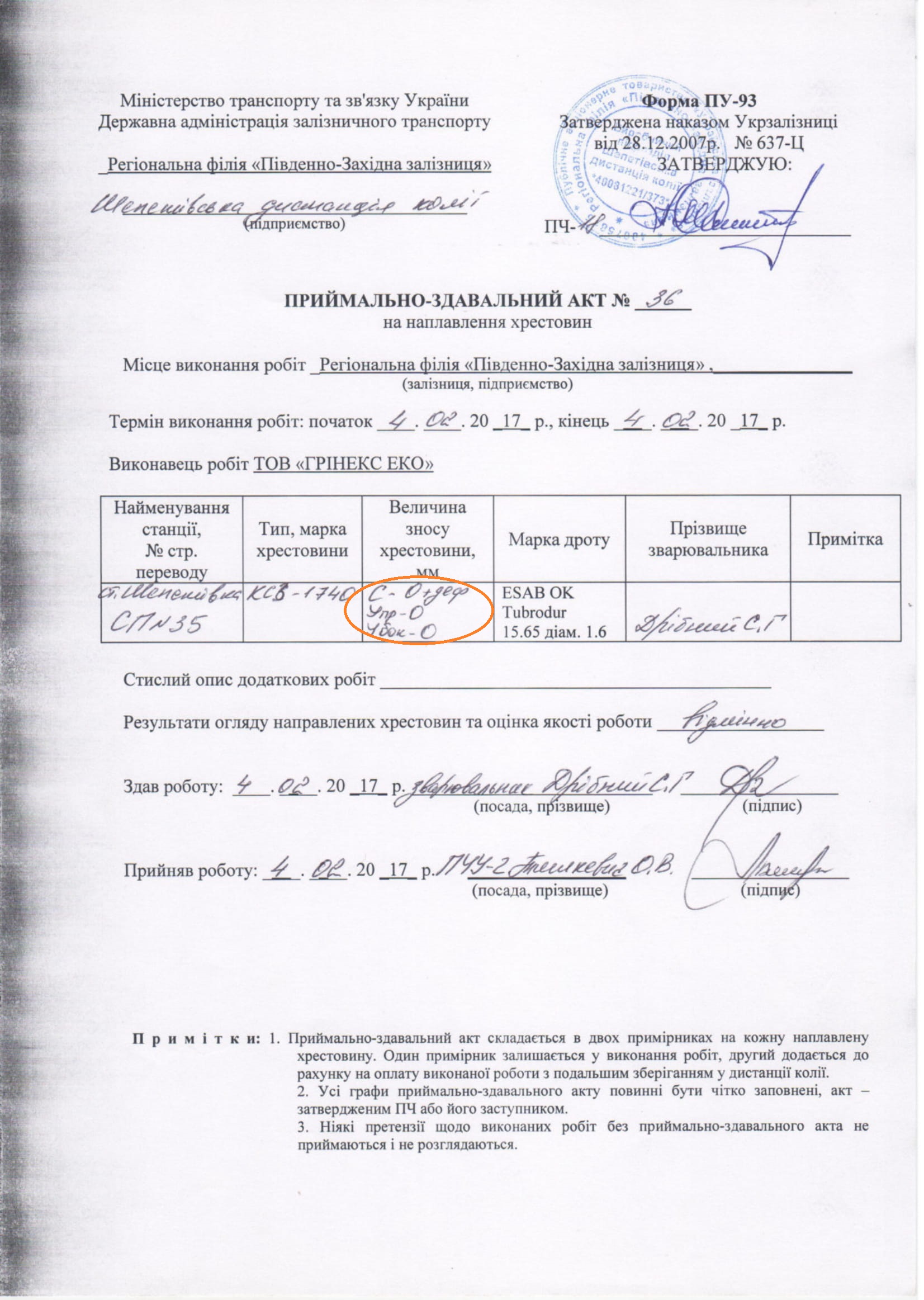- в акті № 33 від 03.02.2017г. взагалі не вказано номер стрілочного переводу, знос сердечника 3 мм вусовиків 0 мм, що дає підставу вважати що таке наплавлення взагалі не відбулося.