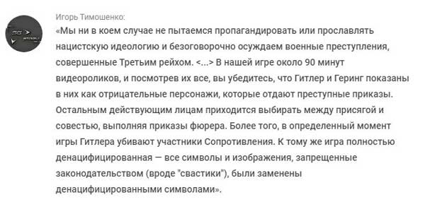 В то же время руководитель студии-разработчика Strategic Mind: Blitzkrieg Игорь Тимошенко пытался пояснить, что игра никоим образом не прославляет нацистскую идеологию; более того, все нацистские символы оттуда убрали.