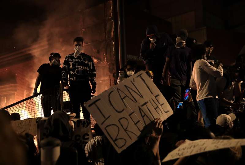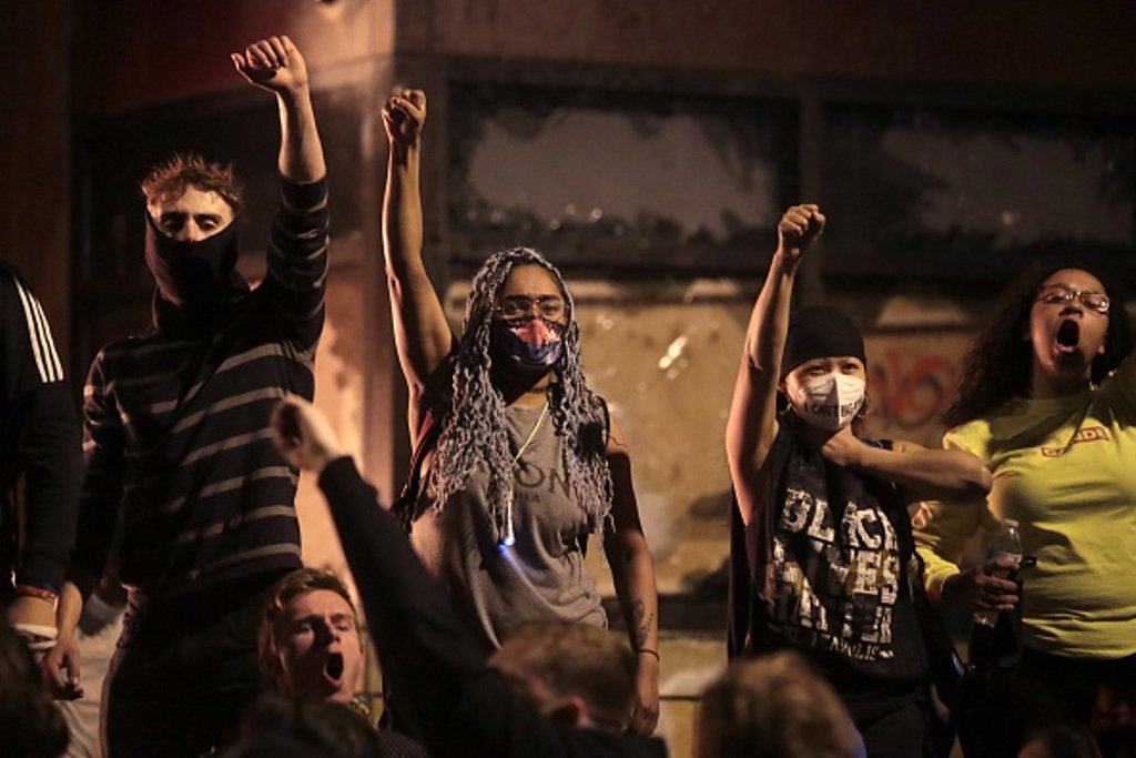 Люди держат в руках плакаты "Хватит убивать чернокожих!", "Справедливость для Джорджа" и другие. В ходе беспорядков протестующие взломали и разграбили более 200 зданий и помещений. В Миннесоте и Атланте объявлено чрезвычайное положение, на помощь призвана Нацгвардия.